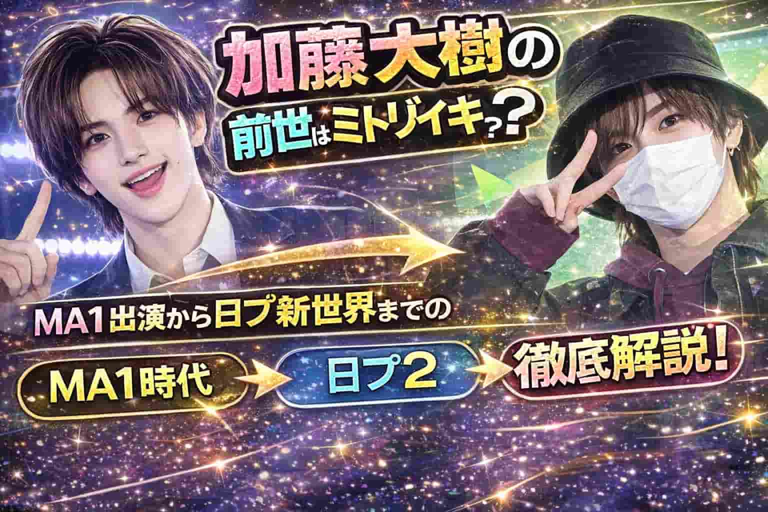 この記事では、加藤大樹さんの前世「ミドリダイキ」時代の活動から、MA1出演、そして日プ新世界までの経歴を時系列で徹底解説していきます!